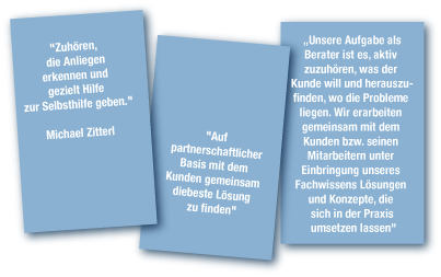 Unsere Aufgabe als Berater ist es, aktiv zuzuhören, was der Kunde will und herauszufinden, wo die Probleme liegen. Wir erarbeiten gemeinsam mit dem Kunden bzw. seinen Mitarbeitern unter Einbringung unseres Fachwissens Lösungen und Konzepte, die sich in der Praxis auch umsetzen lassen...