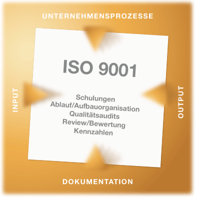 Der Qualitätsstandard nach der Normreihe ISO 9001 gibt den Rahmen vor, den Sie passend zu Ihrem Unternehmen und Ihrer Tätigkeit selbständig ausfüllen. Die "ISO 9000" stellt ein Managementsystem dar. Sie ist Leitfaden für die Strukturierung der gesamten Aufbau- und Ablauforganisationen. Sie hilft, Ihre Tätigkeit auf den Kunden auszurichten. Durch Orientierung am Kunden und Standardisierung der Unternehmensprozesse erfüllen Ihre Produkte und Leistungen die Kundenforderungen. Die Unternehmensressourcen werden möglichst effizient genutzt und es werden - quasi als Nebenprodukt - die geforderten Nachweise erbracht. Dies verringert Unsicherheiten und Barrieren im nationalen und internationalen Geschäftsverkehr und gibt Vertrauen in das Unternehmen. Deshalb ist eine Auftragsvergabe sehr häufig an den Nachweis des Zertifikates nach ISO 9001 gebunden.